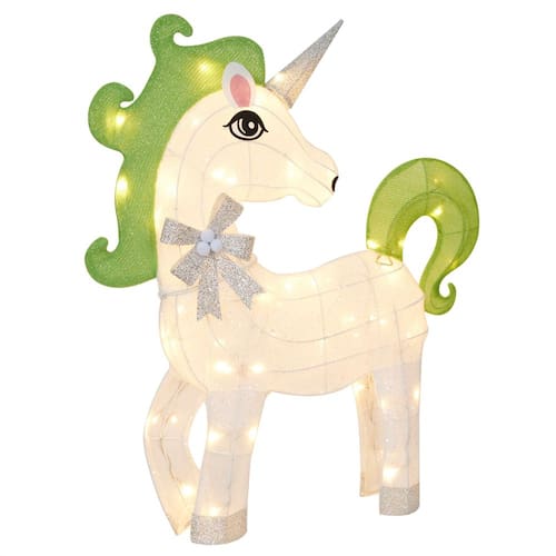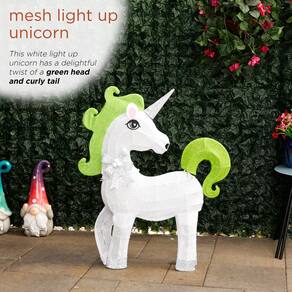- Decoração encantadora de unicórnio: eleve seu espaço com este extravagante unicórnio 3D, com corpo de tecido branco com cabeça e cauda verdes e medindo 30" L x 6" L x 35" H, com 60 luzes LED brancas quentes para uma exibição mágica em ambientes internos ou externos.