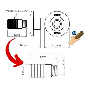 Encaixe tubo de 50mm (classe 15). Interferência por pressão ou silicone neutro. Acabamento em aço inox 304. Luva adaptadora inclusa. Rosca 1 ½’’ em plástico. Vazão de 0 até 9.0 m³/h. Material de ABS/Inox. Aplicação em piscina de alvenaria. Referência: 015482