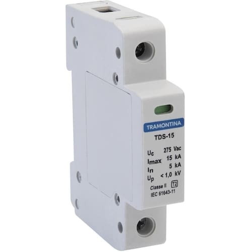 Para garantir a segurança das suas instalações elétricas, o dispositivo de proteção contra surtos Tramontina TDS 1 P 15 kA 275 V Classe II é indispensável. Ideal para proteger a rede contra raios, ele minimiza as chances de queima dos equipamentos. Ele possui tensão de utilização de até 275 V e pode ser utilizado tanto em redes de 127 ou 220 de voltagem. O dispositivo tem tamanho semelhante a um mini disjuntor, tendo 18 milímetros de largura. Para saber a vida útil, basta verificar o indicador frontal: enquanto estiver verde ele estará em funcionamento e quando ficar vermelho deverá ser substituído. Escolha Tramontina e garanta qualidade e eficiência em suas construções!
