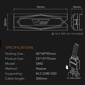 Descrição do produto Características DM2: 1. Projetado para PC desktop, Suporte para ASUS, para Gigabyte, para MSI e outra placa-mãe com 5V 3Pin para alcançar efeito sincronização da mãe ARGB, encaixe perfeitamente para Samsung 850 EVO, 860 EVO, 960 EVO, 970 EVO, 950 PRO, 960 PRO, 970 PRO, etc. 2. Efeitos de iluminação incríveis. 5v-argb compatível com placa-mãe e excelente desempenho de iluminação 3. Liga de Alumínio e Dissipação de calor Passivo realiza raios e dissipação de calor de uma vez.