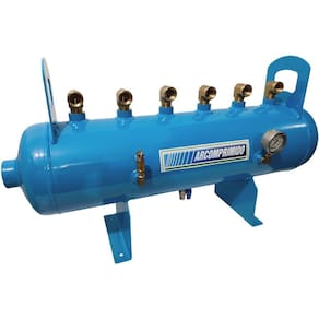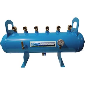 Distribuidor de Ar Industrial DH45-6 (mod.1) com 02 conexões nas calotas, 01 de 2'' e 01 de 1". 06 saídas superior de 1". Luvas laterais para acessórios de segurança (manômetro e válvula de segurança) de 1/4'' e luva inferior de 1/4'' (dreno). Pressão máxima de trabalho 12,3kg/cm. Dimensões; Altura: 575 mm, Comprimento total: 1030 mm, Diametro corpo: 250 mm, Altura total com alça de movimentação: 575 mm. Acompanha documentação com certificado de teste hidrostático. Acompanha os acessórios de segurança manômetro, válvula de segurança e dreno Manual - necessários para uso. Acrescentado cotovelo Macho-Fêmea de 1'' NPT.