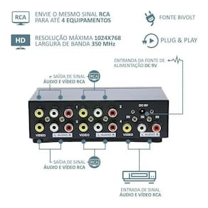 distribuidor rca áudio vídeo composto 1x4 splitter av