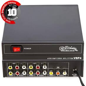 Distribuidor Vídeo Splitter Rca 1 Para 4 - Kit Com 10 Conecte 4 monitores com entradas RCA com qualidade de som e imagem com o Distribuidor Vídeo Splitter RCA 1 para 4. Ideal para ligações em locais públicos como shopping centers, lojas, salas de reunião, rodoviárias, aeroportos, entre outros locais de grande circulação de pessoas. Distribua som e imagem RCA para até 65 metros sem dificuldades. Acompanha forte de energia. Especificações: Vídeo Impedância de Entrada: 0,8 - 1 Vppp/75 ohms Impedância de Saída: 0,8 - 1,4 Vppp/75 ohms Frequência: 50hz Conectores de Entrada: RCA Fêmea Conectores de Saída: RCA Fêmea Áudio Impedância de Entrada: 2V RMS /47 ohms Impedância de Saída: 2V RMS / 1 Kohms Frequência: 10hz - 20KHz Conectores de Entrada: RCA Fêmea Conectores de Saída: RCA Fêmea Garantia: 3 meses Conteúdo da embalagem: 1 Splitter 1 Fonte de energia 1 Manual Peso: 240 gramas Comprimento AxLxP: 4 x 13 x 8 cm Atenção: Verifique a compatibilidade com seu equipamento antes da compra, não nos responsabilizamos por incompatibilidades.