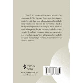 Ditos de luz e amor reúne frases breves e inspiradoras de São João da Cruz, que iluminam o caminho espiritual com sabedoria e profundidade. São palavras que nascem da experiência mística de alguém cuja santidade chegou a um nível tão profundo a ponto de, por sua simplicidade, tocar o coração de todo ser humano. Nesta obra, encontramos orientação para viver a fé com autenticidade, coragem e esperança, mesmo nos momentos de silêncio e aridez.