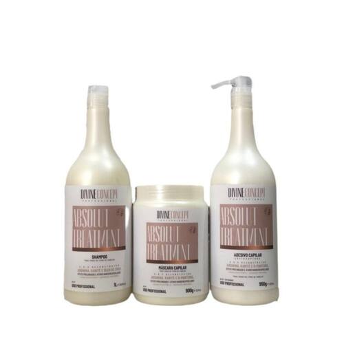 Divine concept kit absolut treatment Shampoo absolut treatment: foi desenvolvido para limpar os fios e prepará-los para receber todo o tratamento. Equilibra o ph dos fios e inicia a reposição de aminoácidos, deixando os cabelos prontos para receber o adesivo capilar antirruptura. O adesivo capilar antirruptura é um produto multifucional podendo ser utilizado com ou sem enxágue, é um tratamento profundo de reposição de aminoácidos para os fios. Possui a tecnologia hma-plex, sistema adesivo composto pelos aminoácidos: cisteina, lisina, arginina e glicina. Tecnologia esta que permite que os aminoácidos se fixem aos fios como um adesivo, permanecendo por um tempo prolongado. Estabiliza e repõe os aminoácidos essenciais aos cabelos, devolvendo assim a estrutura perdida devido aos desgastes naturais ou ainda danos ocasionados por processos químicos. Excelente para seu antes ou pós mar e piscina, pois protege os fios dos danos. A máscara absolut treatment é um tratamento profundo para os fios. Possui a tecnologia hma-plex, sistema adesivo composto pelos aminoácidos: cisteína, lisina, arginina e glicina. Tecnologia está que permite que os aminoácidos se fixem aos fios como um adesivo, permanecendo por um tempo prolongado. Estabiliza e repõe os aminoácidos essenciais aos cabelos, devolvendo assim a estrutura perdida devido aos desgastes naturais ou ainda danos ocasionados por processos quimícos. O kit contém: 01 shampoo 1l 01 máscara 900g 01 adesivo capilar 950g Marca: Não Informado Ean: 7896373011162