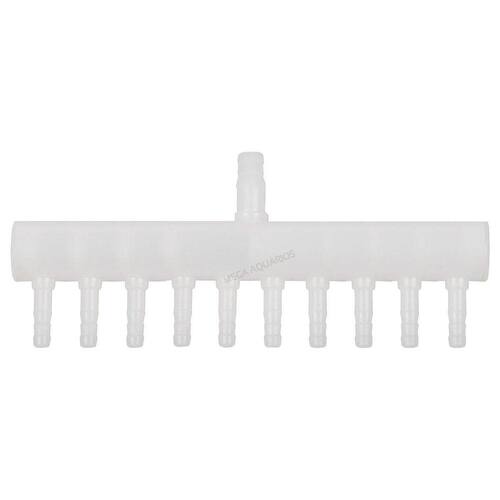 Características: Distribui o ar igualmente para 10 saídas Entrada de ar de 8mm Saídas de ar de 4mm Plástico resistente Fácil instalação