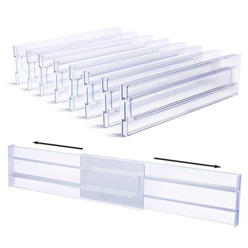 Pacote com 8 gavetas ajustáveis de plástico transparente, divisórias e organizadores. Dimensão: 3,2 polegadas de altura, expansíveis de 12,2 a 21,4"