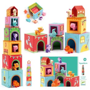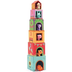 Empilhe os seis blocos de papelão resistentes para fazer uma torre para os seis animais de vinil macios para jogar peek-a-boo ou aninhar os cubos dentro uns dos outros para fácil armazenamento. Maior caixa mede 5" Sq.