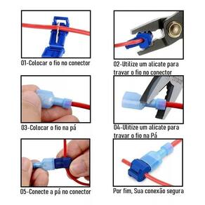 Conteúdo e especificação do kit - 20 conectores completos vermelhos conector tipo t + machos Aplicação: fios e cabos de 0,5 a 1,5mm - 20 conectores completos azuis conector tipo t + machos Aplicação: fios e cabos de 1,5 a 2,5mm - 10 conectores completos amarelos conector tipo t + machos Aplicação: fios e cabos de 4 a 6mm