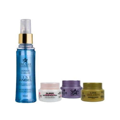 Doador de Brilho Line Angel 90ml Dyusar Professional Hair Descrição: O Doador de Brilho Line Angel é um óleo capilar que proporciona brilho intenso aos fios e elimina odores do dia a dia. Modo de Uso: Agite bem antes de usar. Aplique o produto a uma distância de 15 a 20 cm dos cabelos, sobre toda a extensão dos fios. Pode ser antes ou após a escova ou prancha. ANVISA: 25351.755552/2018-37 Máscara Super Reconstruction 40g Dyusar Professional Hair Descrição: Máscara capilar com efeito teia que proporciona hidratação profunda, nutrição intensa, maleabilidade, brilho e sedosidade. Modo de Uso: Após lavar os cabelos, aplique o produto em toda a extensão dos fios. Massageie e deixe agir por aproximadamente 7 minutos. Enxágue bem. Precauções: Uso externo. Evitar contato com os olhos. Em caso de contato acidental, enxaguar abundantemente com água. Manter fora do alcance de crianças. Produto aprovado pela ANVISA. Máscara Hidratante Line Golden 40g Dyusar Professional Hair Descrição: Máscara capilar que protege a fibra capilar, recupera a integridade dos fios e promove maciez e brilho intenso. Modo de Uso: Após lavar os cabelos, aplique o produto em toda a extensão dos fios. Massageie e deixe agir por aproximadamente 7 minutos. Enxágue bem. Precauções: Uso externo. Evitar contato com os olhos. Em caso de contato acidental, enxaguar abundantemente com água. Manter fora do alcance de crianças. Produto aprovado pela ANVISA. Máscara S.O.S Protect Antioxidante 40g Dyusar Professional Hair Descrição: Máscara capilar que controla o pH dos fios, promove maciez, melhora a elasticidade e combate os radicais livres, com ação antioxidante e reconstrutora. Modo de Uso: Após lavar os cabelos, aplique o produto em toda a extensão dos fios. Massageie e deixe agir por aproximadamente 7 minutos. Enxágue bem. Precauções: Uso externo. Evitar contato com os olhos. Em caso de contato acidental, enxaguar abundantemente com água. Manter fora do alcance de crianças. Produto aprovado pela ANVISA.