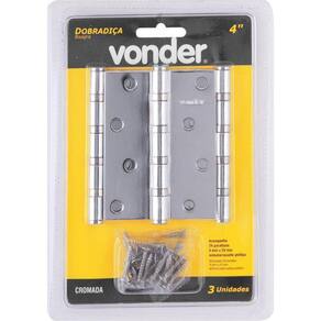 Indicada para fixação em portas mais pesadas, por exemplo: portas de madeira maciça. Não solta o pino. Possui pino com 4 anéis/rolamentos, proporcionando maior durabilidade, além de acabamento cromado que confere maior resistência à oxidação/corrosão. - Medida da dobradiça polegadas : 4 Material/acabamento da dobradiça: Aço carbono cromado Capacidade de carga kgf : Aproximadamente 35 kgf do conjunto CDC : legal: 90 dias Marca: Vonder Itens: Blister com 3 dobradiças de 4 polegadas + 24 parafusos. Marca: Não Informado