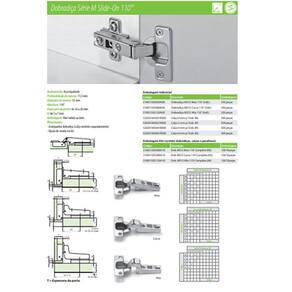 A dobradiça tn slide-on 105º tem a montagem simples, realizada através do deslizamento da dobradiça sobre o calço. Que possui regulagem lateral vertical e horizontal para melhor alinhamento das portas e é fixada no calço por duas linhas de fixação no sistema slide-on deslizante