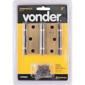 Conteúdo da embalagem3 Dobradiças. Acompanha: 18 parafusos 3,5 mm x 19 mm autoatarraxantes phillips.Aplicações e dicas de usoIndicada para fixação em portas mais pesadas, por exemplo: portas de madeira maciçaDestaques e diferenciaisPossui pino com 2 anéis/rolamentos, proporcionando maior durabilidade, além de acabamento latonado que confere maior resistência à oxidação/corrosão DETALHES TÉCNICOS Medida da dobradiça pol : 3.1/2 Material/acabamento da dobradiça: Aço carbono latonado