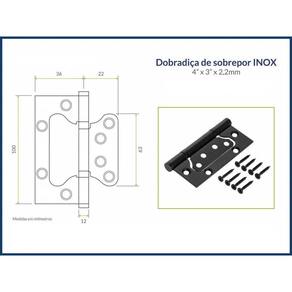 Dobradiça inox sobrepor 4 x 3 descrição: - dispensa rebaixo na madeira- fácil instalação, não necessita de técnico- material anti-oxidante resistente à maresia, não enferruja- eixo blindado + rolamentos anti ruídos- dobradiça 100% produzida em aço inox.- capacidade de peso: 30kg por dobradiça medidas:- 4 x 3 x 2,3mm 10cm x 7,5cm aberta - espessura 2,2mm Marca: Component