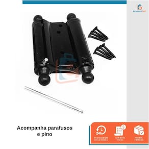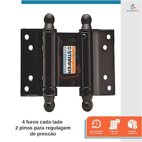 A dobradiça vai e vem é ideal para portas de alta circulação, como cozinhas, restaurantes, bares, hospitais e janelas bang bang. Produzido em material excelente, alongando sua durabilidade e de simples instalação. INSTRUÇÕES DE INSTALAÇÃO- 1 Usar o parafuso de madeira para fixar a dobradiça;Para instalar as dobradiças não é importante saber se a porta abre para o lado direito ou esquerdo. Aviso: É melhor o furo de ajuste estar na parte superior com a abertura da porta para o lado esquerdo ou o furo de ajuste estar na parte inferior com a abertura da porta para o lado direito.- 2 Insira o pino no buraco de ajuste e gire-o na direção que se afaste da prancha da porta. Então insira o pino dentro do buraco e aperte a mola gradualmente até que a porta feche automaticamente;- 3 Se a dobradiça for removida deve ser ajustada novamente na próxima instalação. CARACTERÍSTICAS TÉCNICAS:Material: Aço inoxMedidas: 7,6cm 3 4 furos cada lado 2 pinos para regulagem de pressãoComprimento com pino: 100mmCapacidade: 50kgAcompanha parafuso e pinoMarca: StarferRef.: 4032004