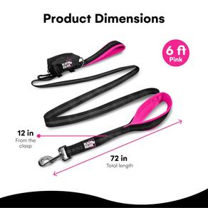 - Alças duplas versáteis: possui 2 alças estrategicamente colocadas coleira rosa para cães; uma se estende até 1,8 m para caminhadas relaxadas; segundo, uma alça de trânsito, está posicionada a 300 metros do fecho para melhor controle