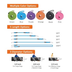 Vários tamanhos e diâmetros. Coleira longa para cães: 3 m, 16 pés, 30 pés, 50 pés e 30 m, vários tamanhos podem atender a diferentes propósitos de treinamento. Nossa coleira para cães está disponível em diâmetro 1/3", 3/8", 1/2". O diâmetro de 0,6 cm pode atender cães pequenos, gatos ou outros animais pequenos. O diâmetro de 9,5 mm e 1,27 cm é a melhor escolha para treinamento de trelas para cães grandes ou médios.