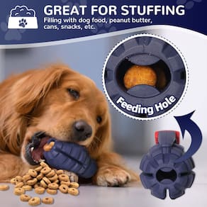 Brinquedos interativos para cães. Os cães adoram brincadeiras interativas e o brinquedo para cães pode ser utilizado para treinar, buscar e puxar. Jogue o brinquedo e deixe seus cães recuperá-lo. Ou adicionada a corda DIY no meio do brinquedo, é o brinquedo perfeito para brincar de cabo de guerra. Brinquedos de mastigar para cães. O brinquedo granada para cães é um brinquedo de mastigar ultradurável. Pode proporcionar horas de diversão na mastigação, mesmo quando não está cheio de lanches ou sendo utilizado como um brinquedo interativo. Brinquedos de recompensa para cães. A coisa mais fácil de colocar em um brinquedo granada para cães, inserindo guloseimas para cães, incluindo comida de cachorro ou carne seca. A manteiga de amendoim também é a favorita, espalhando manteiga de amendoim na superfície, deixe seus cães trabalharem. - Necessidades instintivas: este brinquedo de mastigar granada de forma legal ajuda a satisfazer as necessidades instintivas dos cães e fornece estimulação mental; brincadeiras saudáveis são importantes para o desenvolvimento físico e mental dos cães; ao incentivar brincadeiras saudáveis e satisfazer as necessidades instintivas, este brinquedo ajuda a resolver a mastigação, ansiedade de separação, dentição, tédio, gerenciamento de peso, treinamento de caixa, escavação, latidos e muito mais - Qualidade indestrutível: é um brinquedo indestrutível para cães mastigadores agressivos; nosso brinquedo de mastigar para cães é extra firme e durável, não é quebradiço em pedaços ou quebrado em metades quando mastigado; a força de resistência ao rasgo de nossos brinquedos para cães granada é mais durável do que a maioria dos brinquedos para cães; testado e aprovado por pastores alemães, pit-bulls, American Foxhound, Mastins, Alasca e muitos outros animais mastigadores gressivos; enquanto nenhum brinquedo para cães é realmente indestrutível, mas este chega muito perto - Ótimo para recheio: o brinquedo para animais de estimação é ainda mais atraente quando recheado com ração, manteiga de amendoim, petiscos fáceis, lanches ou ziguezinhos; pode ser lavado na lava-louças para facilitar a limpeza; Comprimento-7,6 cm, altura - 10,7 cm; Tamanho perfeito para cães pequenos, médios e grandes - Seguro para mastigar: nossos brinquedos duráveis para mastigar para cães são feitos de borracha, inofensivos, seguros para cães e pessoas; mesmo que os cães engulam alguns detritos por engano, não se preocupe, eles defecarão juntos no dia seguinte - Brincadeira versátil: este brinquedo para animais de estimação não é apenas ótimo para mastigar, mas sua forma única e borracha grossa são ótimos para rolar e quicar; divertido para mastigar, perseguir e buscar
