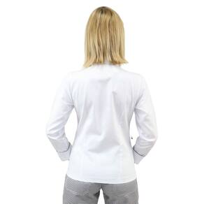 Possui gola padre e acabamento em viés Pied Poule que combina perfeitamente com a calça cozinheiro inspirando elegância.