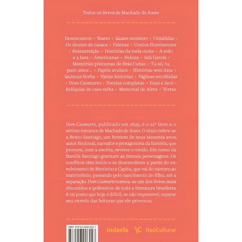 É o 21º livro e o sétimo romance de Machado de Assis. O título refere-se a Bento Santiago, um homem de seus sessenta anos, autor ficcional, narrador e protagonista da história, que procura, com a escrita, reviver o vivido. Em torno da família Santiago gravitam as demais personagens. Os conflitos têm início e se desenvolvem a partir do envolvimento de Bentinho e Capitu, que vai do namoro ao matrimônio, passando pelo nascimento do filho, até a separação. Dom Casmurro tornou-se um dos livros mais discutidos e polêmicos de toda a literatura brasileira. A tal ponto que hoje é difícil, se não impossível, separar seu enredo das interpretações que ele provocou.