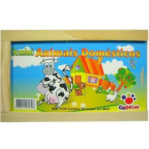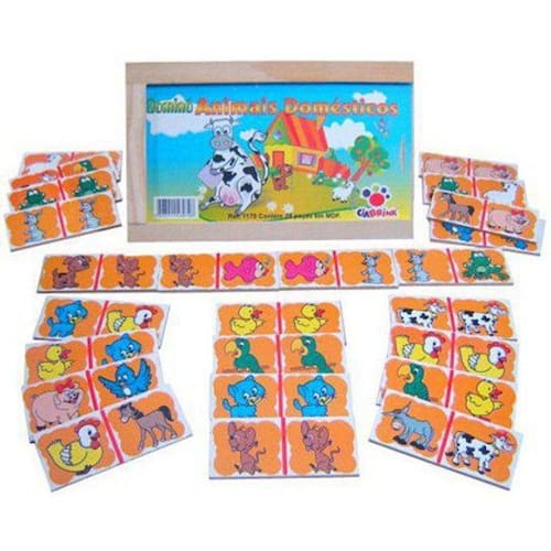 Dominó Animais Domésticos - Ciabrink O Dominó Animais Domésticos é fabricado em madeira MDF contendo 28 peças. Excelente jogo que promove associação entre os desenhos. O Dominó traz todos os bichos domésticos que se identificam com a criança. O Dominó Animais Domésticos é um material utilizado em todas as etapas da alfabetização sendo apropriado para todos os métodos de ensino e aprendizagem. Ref: 1170 Desenvolve o espírito de competição, concentração, discriminação entre figuras e percepção visual ocorrendo de uma maneira fácil e muito divertida. Medidas de cada placa: 7x3 cm. Medidas da caixa de madeira: 17x10x4 cm. Idade: a partir de 3 anos. INMETRO CE-BRI/ICEPEX-N 00934-29 NBR NM 300/2004