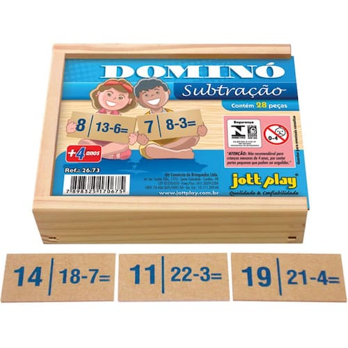 - DOMINÓ DE SUBTRAÇÃO Descrição do Produto: Uso: Formação de sequências, relacionando a operação com o seu resultado. Desperta a atenção do aluno para a necessidade de operacionalizar mentalmente inclusive com duplas possibilidades, pois podem-se colocar as peças em qualquer das extremidades. Desenvolve: Raciocínio matemático, atenção, cálculo mental, fixação do conteúdo, integração em grupo. Composição de cada jogo : 28 peças de madeira, com impressão de operações e seus resultados. Acondicionados em caixa de madeira medindo 05x9x27cm. INMETRO CE-BRI/003N 3107-07 NM300/2002 Ean: 7898325170675