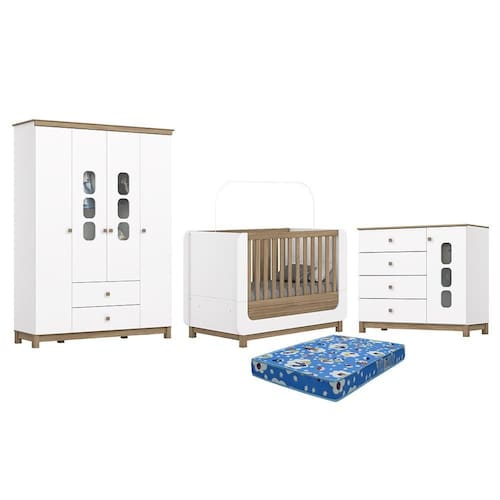 O Dormitório Infantil Aconchego é produzido em MDF e MDP, com pintura UV atóxica e acabamento brilho. O guarda-roupa possui 4 portas, 2 gavetas com corrediças telescópicas, cabideiro em alumínio e prateleiras internas. A cômoda conta com 1 porta, 4 gavetas e amplo espaço interno. O berço americano mini cama tem 2 regulagens de estrado, transforma-se em mini cama, é certificado pelo INMETRO e acompanha colchão Baby Physical Ortobom em espuma D18, antiácaro e antialérgico.