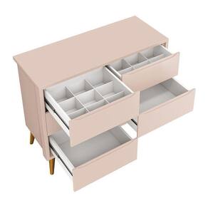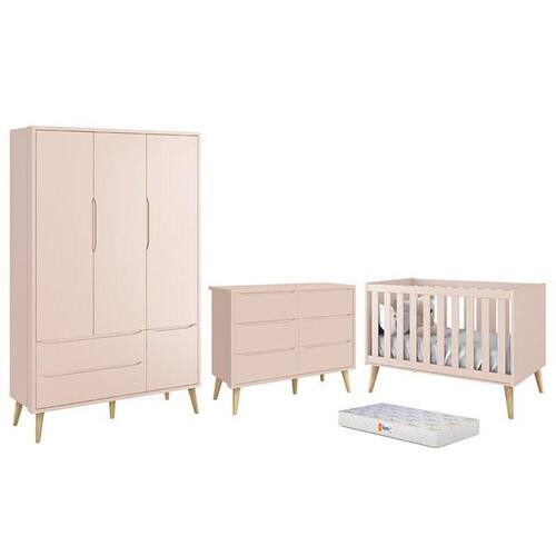 Dormitório Completo Infantil Theo 3 Portas, Cômoda 6 Gavetas, Berço com Pés Madeira Natural e Colchão D18 - Reller Móveis - Rosa