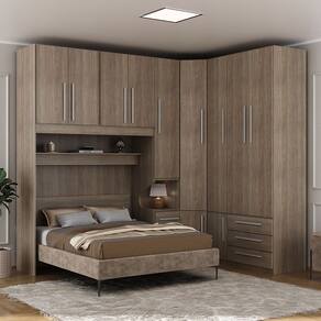 * Colchão, cama e itens de decoração não estão inclusos. Imagens meramente ilustrativas. Ideal para casais que procuram de um dormitório com bom espaço interno e o mesmo tempo compacto para os ambientes das grandes metrópoles. - 01 Guarda-roupa de 4 e 3 gavetas modelo 1249; - 01 Armário de Canto Sextavado modelo 1231; - 01 Guarda-roupa de 1 porta e 3 gavetas com mesa de cabeceira embutida modelo 1416 direito; - 01 Maleiro de casal 4 portas modelo 1226; - 01 Painel para cama Box de casal modelo 1217.