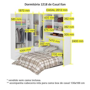 Dormitório De Casal 1218 Esquerdo Carvalho Claro * Colchão, cama e itens de decoração não estão inclusos. Imagens meramente ilustrativas. Ideal para casais que procuram de um dormitório com bom espaço interno e o mesmo tempo compacto para os ambientes das grandes metrópoles. - 01 Guarda-roupa de 4 e 3 gavetas modelo 1249; - 01 Armário de Canto Sextavado modelo 1231; - 01 Guarda-roupa de 1 porta e 3 gavetas com mesa de cabeceira embutida modelo 1416 esquerdo; - 01 Maleiro de casal 4 portas modelo 1226; - 01 Painel para cama Box de casal modelo 1217. ATENÇÃO. Produto vendido para ser montado conforme a ilustração (canto para lado esquerdo). Para montagem invertida adquirir o modelo direito. DIMENSÕES DO PRODUTO MONTADO - ALTURA 240 CM; - LARGURA 261 CM; - PROFUNDIDADE 51CM NOS ARMÁRIOS E 187CM LATERAL (CONSIDERAR AO MENOS 190CM PARA A CAMA NÃO INCLUSA) Vão livre de 145cm de comprimento por 110cm de altura abaixo do maleiro. Para compras de dormitórios sem a cama inclusa lembre-se sempre de verificar se a cabeceira da sua cama cabe neste espaço. Produto entregue desmontado. Requer montagem. Manual disponível no site do fabricante. Atenção: Não nos responsabilizamos, no ato da entrega, por desmontagens, subir escadas/elevadores ou transporte por guincho para apartamentos. Eventuais despesas são de responsabilidade do cliente. Confira as dimensões deste produto e certifique-se de que o mesmo passará normalmente por supostos elevadores, portas, escadas e/ou corredores de sua moradia.
