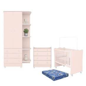 Dormitório Doce Sonho Guarda Roupa, Cômoda Trocador, Berço Rosa Acetinado Com Rodízio E Colchão Baby Physical - Qmovi Rosa Acetinado