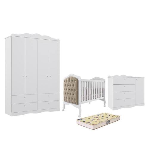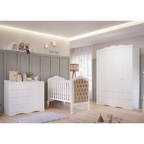 Dormitório Guarda Roupa, Cômoda e Berço Harmonia com Capitonê e Colchão Supreme - Permóbili Baby