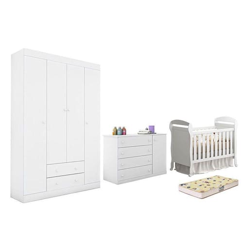 Dimensões: Tamanho do Guarda-Roupa (L x A x P): 147 x 203 x 45 cm Tamanho da Cômoda (L x A x P): 105 x 92 x 45 cm Tamanho do Berço (L x A x P): 148 x 120 x 78 cm Tamanho do Colchão (L x A x P): 70 x 10 x 130 cm