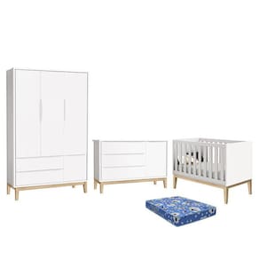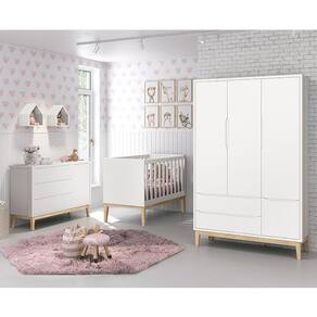 Dormitório Infantil Classic 3 Portas, Cômoda 1 Porta, Berço com Pés Madeira Natural e Colchão - Reller Móveis - Branco