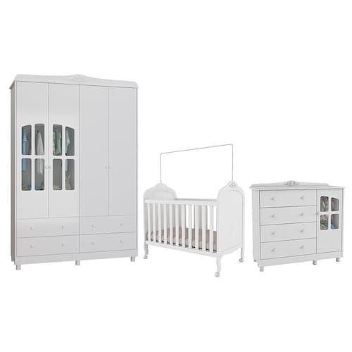 O Dormitório Infantil Elô oferece praticidade, segurança e ótimo aproveitamento de espaço para o quarto do bebê. O guarda-roupa possui 4 portas, 4 gavetas com corrediças telescópicas, cabideiro e prateleiras. A cômoda conta com 1 porta, cabideiro, prateleira interna e 4 gavetas. Ambos são feitos em MDF com pintura UV atóxica, puxadores e pés em plástico. Possui 3 regulagens de altura do estrado, rodízios com trava, suporte para mosquiteiro e é certificado pelo INMETRO. Recomendado para colchão 130 x 70 cm (não incluso). Um conjunto completo e funcional para acompanhar todas as fases do bebê.