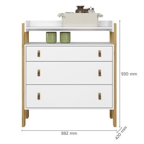 Cômoda Infantil Fantasia 3 Gavetas com Nicho - Qmovi Estrutura em MDP Pintura UV 3 Gavetas Corrediças telescópicas Puxadores inspirados no couro em TPU Nicho e prateleira Sistema antitombamento Pés em MDF de 25mm Suporta até 35Kg distribuídos