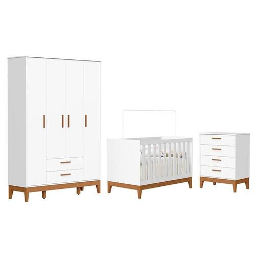 O Dormitório Infantil Flip traz praticidade e charme para o quarto do bebê. O guarda-roupa em MDF com pintura UV atóxica possui 4 portas, 2 gavetas, cabideiro em alumínio, prateleiras internas e pés em madeira. A cômoda conta com 4 gavetas com corrediças telescópicas, puxadores revestidos, cantos arredondados e sistema antitombamento. Já o berço americano, certificado pelo INMETRO, transforma-se em mini cama, possui 3 regulagens de altura no estrado, cabeceira arredondada, pés em madeira. Um conjunto completo, seguro e elegante para o dia a dia.