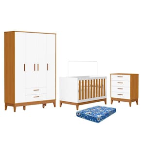 O Dormitório Infantil Flip traz praticidade e charme para o quarto do bebê. O guarda-roupa em MDF com pintura UV atóxica possui 4 portas, 2 gavetas, cabideiro em alumínio, prateleiras internas e pés em madeira. A cômoda conta com 4 gavetas com corrediças telescópicas, puxadores revestidos, cantos arredondados e sistema antitombamento. Já o berço americano, certificado pelo INMETRO, transforma-se em mini cama, possui 3 regulagens de altura no estrado, cabeceira arredondada, pés em madeira. E para completar o Colchão Baby Physical da Ortobom vai proporcionar noites mais tranquilas a aconchegantes. Um conjunto completo, seguro e elegante para o dia a dia.