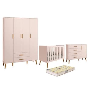 Dormitório Infantil Isis Guarda Roupa 4 Portas, Cômoda 1 Porta E Berço Rosa Com Colchão D18 - Reller Móveis Rosa Dormitório Infantil Isis Guarda Roupa 4 Portas, Cômoda 1 Porta e Berço com Colchão D18 - Reller Móveis O Dormitório Infantil Isis é composto por um Guarda-Roupa, uma Cômoda e um Berço com Colchão. O Guarda Roupa Isis 4 Portas e 2 Gavetas e a Cômoda Infantil Isis 1 Porta e 4 Gavetas ambos oferecem um amplo espaço para organizar os pertences do seu bebê, seus puxadores são em madeira e suas gavetas possuem um amplo espaço interno para guardar as roupinhas do bebê dobradas. Já o Berço Americano Isis se enquadra em todos os termos de qualidade, segurança e durabilidade do produto, pois possui certificação pelo INMETRO e o Colchão Supreme da Gazin foi projetado para que seu bebê tenha confortáveis noites de sono. A elegância do estilo retrô aliada ao conforto. Guarda Roupa Infantil Isis 4 Portas e 2 Gavetas - Reller Móveis - Estrutura 100% MDF - Pintura UV atóxica - Acabamento fosco - 4 Portas - Dobradiças metálicas - 2 Gavetas - Corrediças telescópicas - Cabideiro metálico - Prateleira interna - Puxadores em madeira - Pés estilo retrô em madeira - Amplo espaço interno