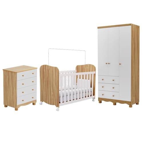 O Dormitório Infantil Júnior com Guarda Roupa, Cômoda e Berço Uli é a escolha ideal para montar um quarto completo, funcional e seguro para o bebê. O guarda-roupa conta com 3 portas, 3 gavetas com corrediças telescópicas, cabideiro metálico e prateleiras, oferecendo excelente organização e amplo espaço interno. A cômoda possui 4 gavetas espaçosas com ótima profundidade e estrutura firme, facilitando o dia a dia dos pais. Já o berço Uli é certificado pelo INMETRO, possui 3 regulagens de altura do estrado, grades fixas e rodízios para facilitar a mobilidade, além de bordas laqueadas que proporcionam um toque de cuidado extra. Um conjunto completo para garantir conforto, praticidade e estilo ao quarto infantil.
