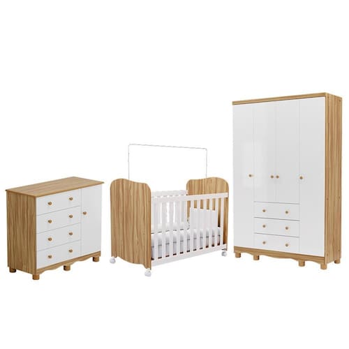 O Dormitório Infantil Júnior é funcional, seguro e ideal para o dia a dia do bebê. O guarda-roupa tem 4 portas, 3 gavetas com corrediças telescópicas, cabideiro e prateleira. A cômoda possui 1 porta com prateleira, 4 gavetas espaçosas e estrutura em MDF com pintura UV atóxica. Ambos com puxadores em plástico, pés resistentes e duas opções de rodapé. O berço Uli tem 3 regulagens de altura do estrado, grades fixas, rodízios com trava, suporte para mosquiteiro, certificação INMETRO e o colchão indicado é 130 x 70 cm (não incluso). Conjunto compacto, prático e completo para o quarto do bebê.