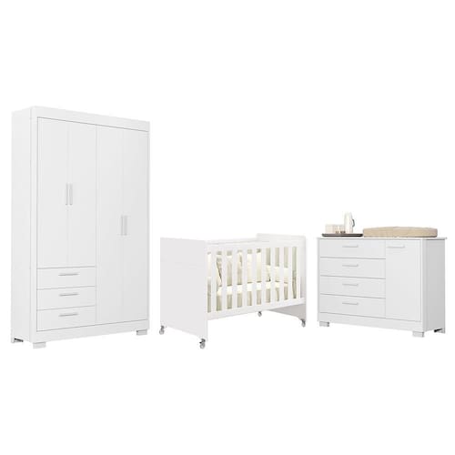 O conjunto perfeito para organizar e compor o quarto do bebê com segurança, praticidade e estilo. O Guarda Roupa Zaki possui 4 portas, 3 gavetas com corrediças telescópicas, cabideiro metálico e pés em PVC, oferecendo amplo espaço interno e estrutura resistente em MDF com pintura UV atóxica. A Cômoda Zaki vem com 1 porta e 4 gavetas, sistema antitombamento, puxadores em MDF e pés em PVC, garantindo funcionalidade e segurança no dia a dia. O Berço Evolution 4 em 1 pode ser utilizado como mini berço, berço, sofá-cama e mini cama. Com 3 regulagens de altura do estrado, rodízios em gel (2 com trava) e certificação INMETRO, é versátil e seguro para acompanhar o crescimento da criança.