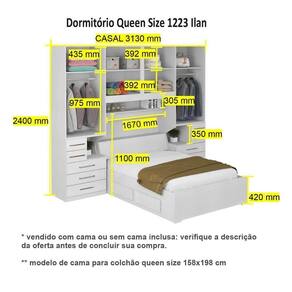 Dormitório Queen Size Completo 1223 Carvalho Claro * Colchão e itens de decoração não estão inclusos. Imagens meramente ilustrativas. Dormitório de casal com cama embutida, versão mais simples, mas que de simples não tem nada: são 2 guarda-roupas com 10 gavetas no total, um maleiro de 4 portas bem espaçoso e com espaço interno para aproveitar seu cômoda da melhor forma. A cama de casal com baú além de muito resistente e confortável também agrega mais espaço com suas 4 gavetas, duas de cada lado. O dormitório é na verdade um conjunto de módulos. Você pode mudar a composição trocando ou adicionando módulos conforme seu gosto e seu espaço. - 02 Guarda-roupas de 2 portas e 5 gavetas com mesa de cabeceira embutida modelo 1224; - 01 Maleiro queen size 4 portas modelo 1226; - 01 Cama de Casal Convencional para colchão 158x198 cm com Baú e 4 gavetas modelo 1251. - Corrediças, dobradiças a cabideiros de metal; - Chapa de 15mm de espessura; - Puxadores 256mm; DIMENSÕES DO PRODUTO MONTADO - ALTURA 240 CM; - LARGURA 313 CM; - PROFUNDIDADE 51CM NOS ARMÁRIOS E 229CM NA CAMA Vão livre de 166cm de comprimento por 110cm de altura abaixo do maleiro. Para compras de dormitórios sem a cama inclusa lembre-se sempre de verificar se a cabeceira da sua cama cabe neste espaço. Atenção: Não nos responsabilizamos, no ato da entrega, por desmontagens, subir escadas/elevadores ou transporte por guincho para apartamentos. Eventuais despesas são de responsabilidade do cliente. Confira as dimensões deste produto e certifique-se de que o mesmo passará normalmente por supostos elevadores, portas, escadas e/ou corredores de sua moradia.