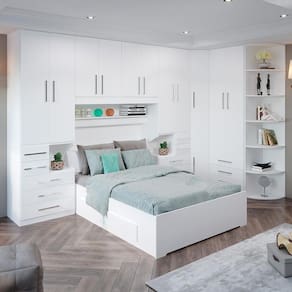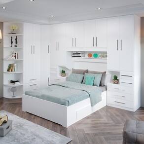 * Colchão e itens de decoração não estão inclusos. Imagens meramente ilustrativas. Dormitório de casal queen size com cama embutida, versão mais completa. A cama de casal queen size com baú além de muito resistente e confortável também agrega mais espaço com suas 4 gavetas, duas de cada lado. O dormitório é na verdade um conjunto de módulos. Você pode mudar a composição trocando ou adicionando módulos conforme seu gosto e seu espaço. – 02 Guarda-roupas de 2 portas e 5 gavetas com mesa de cabeceira embutida modelo 1224; – 01 Maleiro de queen size 4 portas modelo 1226; – 01 Armário de Canto Sextavado modelo 1231; – 01 Guarda-roupa de 2 portas e 3 gavetas modelo 1228; – 01 Cantoneira com 6 prateleiras curvas modelo 1322; – 01 Cama de queen size Convencional para colchão 158×198 cm com Baú e 4 gavetas modelo 1251; – Puxadores 256mm. DIMENSÕES DO PRODUTO MONTADO - ALTURA 240 CM; - LARGURA 390 CM; - PROFUNDIDADE 51CM NOS ARMÁRIOS E 230CM NA CAMA   Vão livre de 166cm de comprimento por 110cm de altura abaixo do maleiro. Para compras de dormitórios sem a cama inclusa lembre-se sempre de verificar se a cabeceira da sua cama cabe neste espaço.   Atenção: Não nos responsabilizamos, no ato da entrega, por desmontagens, subir escadas/elevadores ou transporte por guincho para apartamentos. Eventuais despesas são de responsabilidade do cliente. Confira as dimensões deste produto e certifique-se de que o mesmo passará normalmente por supostos elevadores, portas, escadas e/ou corredores de sua moradia.