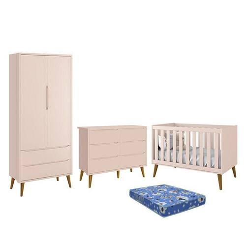 Dormitório Theo 2 Portas, Cômoda 6 Gavetas, Berço Rosa Fosco Com Pés Amadeirado E Colchão - Reller Móveis Rosa Fosco Dormitório Theo 2 Portas, Cômoda 6 Gavetas, Berço com Pés Amadeirado e Colchão - Reller Móveis O Dormitório Completo Infantil Theo é baseado no estilo retrô, traz consigo conceitos de elegância, charme e modernidade. Conta com um belíssimo Guarda-Roupa com excelentes repartições internas para roupinhas ficarem sempre organizadas. A Cômoda 6 gavetas é um ótimo auxilio para o guarda-roupa, oferece espaço para roupas dobráveis e pequenos acessórios. O Berço se transforma em uma charmosa mini cama, acompanhando o desenvolvimento do seu filho e auxiliando na transição do berço para caminha. E para completar o Colchão Baby Physical da Ortobom vai proporcionar noites tranquilas e confortáveis. A escolha certa para deixar o quartinho do bebê mais aconchegante. Guarda Roupa Infantil Theo 2 Portas - Reller Móveis - Estrutura 100% MDF - Pintura UV atóxica - 2 Portas - 2 Gavetas - Amplo espaço interno - Cabideiro metálico - Corrediças telescópicas - Puxadores embutidos - Pés pontiagudos em madeira