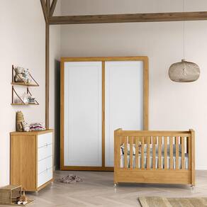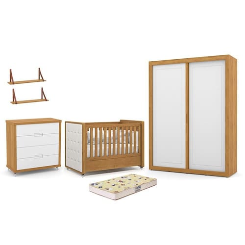O Dormitório Tutto New une elegância e funcionalidade com guarda-roupa, cômoda, berço com capitonê, colchão e prateleiras. O guarda-roupa tem 2 portas, 4 gavetas internas, cabideiros em alumínio e amplo espaço. A cômoda possui 4 gavetas com corrediças telescópicas e um amplo espaço garantindo praticidade. O berço, certificado pelo INMETRO, conta com 3 regulagens de altura, rodízios com trava e se transforma em mini cama, o toque sofisticado fica por conta do capitonê em bouclê acompanhado do colchão Supreme da Gazin e as prateleiras Gold completam o conjunto com conforto e estilo.