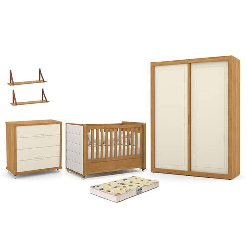 Dormitório Tutto 2 Portas, Cômoda, Berço com Capitonê, Colchão Supreme e Prateleiras - Matic Móveis