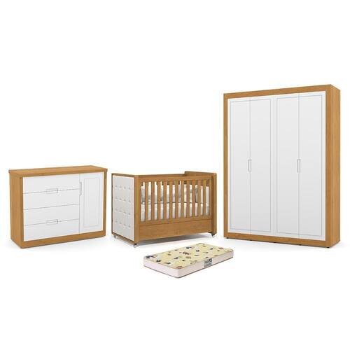 Dormitório Tutto New 4 Portas, Cômoda 1 Porta e Berço com Capitonê e Colchão Supreme - Matic Móveis