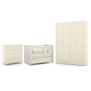 O Dormitório Tutto New é composto por um guarda-roupa, uma cômoda e um berço com capitonê, oferecendo elegância e funcionalidade. O guarda-roupa possui 4 portas com puxadores usinados, 4 gavetas internas, cabideiros em alumínio e amplo espaço interno. A cômoda possui 4 gavetas com corrediças telescópicas e um amplo espaço garantindo praticidade. O berço, certificado pelo INMETRO, tem estrutura em MDF, 3 regulagens de altura no estrado, rodízios com trava e pode ser transformado em mini cama. O toque de sofisticação fica por conta do capitonê em bouclê com espuma antichama.