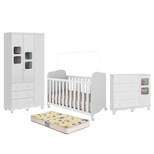 O Dormitório Infantil Uli é a combinação ideal de funcionalidade, segurança e charme para o quarto do bebê. O guarda-roupa possui 3 portas com janelas em acrílico, 3 gavetas com corrediças telescópicas, cabideiro metálico, prateleiras e excelente espaço interno. Estrutura em MDF com pintura UV atóxica, puxadores em plástico, pés resistentes e duas opções de rodapé: usinado ou reto. A cômoda complementa o conjunto com 1 porta com janela, prateleira interna, cabideiro e 4 gavetas espaçosas, mantendo o mesmo padrão de acabamento e praticidade. O berço padrão americano é certificado pelo INMETRO e conta com 3 regulagens de altura do estrado, bordas arredondadas, rodízios com travas e suporte para mosquiteiro. Seguro e confortável, é ideal para acompanhar os primeiros anos do bebê com tranquilidade. E para completar o Colchão Supreme da Gazin vai proporcionar noites mais tranquilas a aconchegantes.